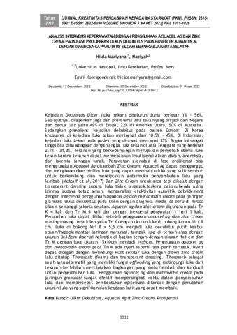 Hilda Mariyana and Naziyah (2023) Analisis intervensi keperawatan dengan penggunaan aquacel ag dan zinc cream pada fase proliferasi ulkus dekubitus pada Pasien Tn.K dan Tn.M dengan diagnosa ca paru di RS Siloam Semanggi Jakarta Selatan. Jurnal Kreativitas Pengabdian kepada Masyarakat, 6 (3): 16. pp. 1011-1026. ISSN 2615-0921