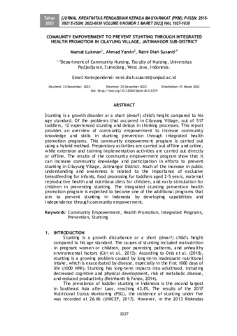Mamat Lukman and Ahmad Yamin and Raini Diah Susanti (2023) Community empowerment to prevent stunting through integrated health promotion in Cilayung Village, Jatinangor Sub-District. Jurnal Kreativitas Pengabdian kepada Masyarakat, 6 (3): 17. pp. 1027-1038. ISSN 2615-0921