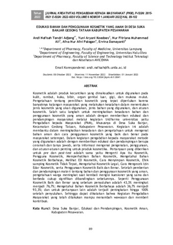 Andi Nafisah Tendri Adjeng and Yuni Aryani Koedoes and Nur Fitriana Muhammad Ali and Afna Nur Afni Palogan and Ervina Damayanti (2023) Edukasi bahan dan penggunaan kosmetik yang aman di Desa Suka Banjar Gedong Tataan Kabupaten Pesawaran. Jurnal Kreativitas Pengabdian kepada Masyarakat, 6 (1): 9. pp. 89-102. ISSN 2615-0921