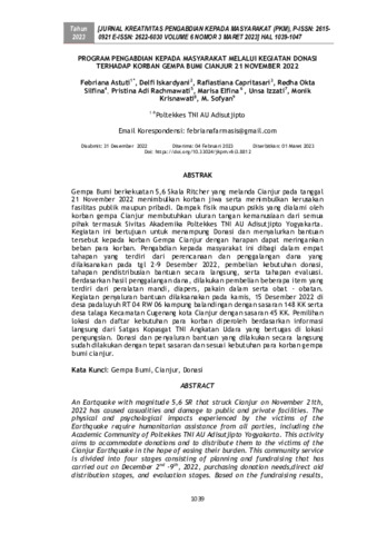 Febriana Astuti and Delfi Iskardyani and Rafiastiana Capritasari and Redha Okta Silfina and Pristina Adi Rachmawati and Marisa Elfina and Unsa Izzati and Monik Krisnawati and M. Sofyan (2023) Program pengabdian kepada masyarakat melalui kegiatan donasi terhadap korban Gempa Bumi Cianjur 21 November 2022. Jurnal Kreativitas Pengabdian kepada Masyarakat, 6 (3): 18. pp. 1039-1047. ISSN 2615-0921