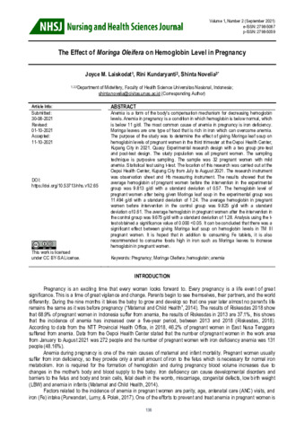 Joyce M., Laiskodat and Rini, Kundaryanti and Shinta, Novelia (2021) The Effect of Moringa Oleifera on Hemoglobin Level in Pregnancy. Nursing and Health Sciences Journal, 1 (2): 9. pp. 136-141. ISSN 2798-5059