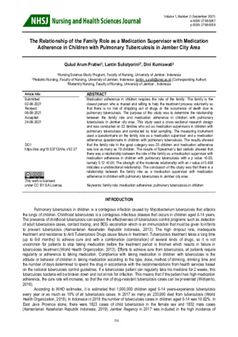 Qulud Arum, Pratiwi and Lantin, Sulistyorini and Dini, Kurniawati (2021) The Relationship of the Family Role as a Medication Supervisor with Medication Adherence in Children with Pulmonary Tuberculosis in Jember City Area. Nursing and Health Sciences Journal, 1 (2): 12. pp. 154-158. ISSN 2798-5059