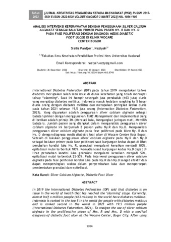 Sisilia Pardjer and Naziyah (2023) Analisis intervensi keperawatan dengan penggunaan silver calsium alginate sebagai balutan primer pada pasien Ny. R dan Ny. D pada fase poliferasi dengan diagnosa medis diabetic foot ulcer di Klinik Wocare Center Bogor. Jurnal Kreativitas Pengabdian kepada Masyarakat, 6 (3): 22. pp. 1084-1100. ISSN 2615-0921