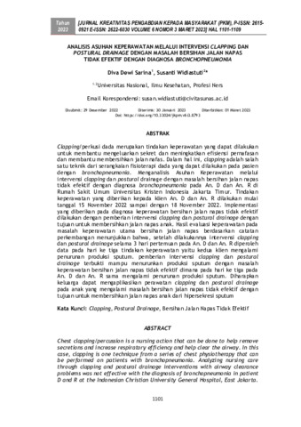 Diva Dewi Sarina and Susanti Widiastuti (2023) Analisis asuhan keperawatan melalui intervensi clapping dan postural drainage dengan masalah bersihan jalan napas tidak efektif dengan diagnose bronchopneumonia. Jurnal Kreativitas Pengabdian kepada Masyarakat, 6 (3): 23. pp. 1101-1109. ISSN 2615-0921