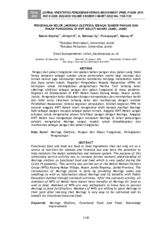 Rahmi Dianita and Afriani H and A. Rahman Sy and Firmansyah and Henny H (2023) Pengenalan kelor (moringa oleifera) sebagai sumber pangan dan pakan fungsional di KWT Melati Muaro Jambi, Jambi. Jurnal Kreativitas Pengabdian kepada Masyarakat, 6 (3): 26. pp. 1128-1138. ISSN 2615-0921