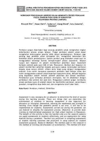 Riswanti Rini and Hasan Hariri and Sudjarwo and Ujang Efendi and Ismu Sukamto and Handoko (2023) Workshop penggunaan android dalam membantu proses penilaian pasca pandemi pada guru di Kabupaten Pesawaran Provinsi Lampung. Jurnal Kreativitas Pengabdian kepada Masyarakat, 6 (3): 27. pp. 1139-1148. ISSN 2615-0921