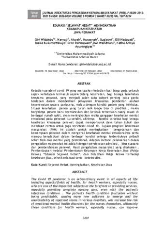 Giri, Widakdo and Naryati, Naryati and Aisyah, Aisyah and Nuraenah, Nuraenah and Sugiatmi, Sugiatmi and Elli, Hadayati and Ineke, Kusumo Waluyo and Erlin, Rahmawati and Dwi, Wendriani and Fatha, Anisya Ayuningtyas (2023) Edukasi “Sejawat Hebat” meningkatkan kemampuan kesehatan jiwa perawat. Jurnal Kreativitas Pengabdian kepada Masyarakat, 6 (3): 34. pp. 1207-1214. ISSN 2615-0921
