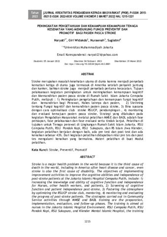 Naryati and Giri Widakdo and Nuraenah and Sugiatmi (2023) Peningkatan pengetahuan dan kemampuan tenaga kesehatan yang mendukung fungsi preventif dan promotif bagi pasien pasca stroke. Jurnal Kreativitas Pengabdian kepada Masyarakat, 6 (3): 35. pp. 1215-1221. ISSN 2615-0921