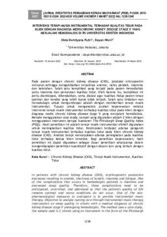 Okta Dwistyana Putri and Dayan Hisni (2023) Intervensi terapi musik instrumental terhadap kualitas tidur pada klien dengan diagnosa medischronic kidney disease stage v yang menjalani hemodialisis di RS Universitas Kristen Indonesia. Jurnal Kreativitas Pengabdian kepada Masyarakat, 6 (3): 37. pp. 1238-1246. ISSN 2615-0921