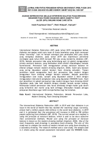 Indah Puspitasari Dewi and Rizki Hidayat and Naziyah (2023) Asuhan keperawatan melalui intervensi balutan foam dressing sekunder pada pasien diagnosis medis Diabetic Foot Ulcer (DFU) di Klinik Home Care Setia. Jurnal Kreativitas Pengabdian kepada Masyarakat, 6 (3): 39. pp. 1258-1267. ISSN 2615-0921