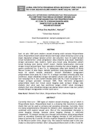 Dithya Ema Maulidha and Naziyah (2023) Analisis intervensi keperawatan penggunaan polyurethane foam sebagai secondary dressing dan terapi ozone bagging pada fase proliferasi pasien Ny. E dan Tn. D dengan diagnosa medis Diabetic Foot Ulcer di Klinik Wocare Kota Bogor. Jurnal Kreativitas Pengabdian kepada Masyarakat, 6 (3): 40. pp. 1268-1281. ISSN 2615-0921