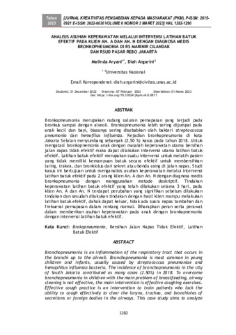 Melinda Aryani and Diah Argarini (2023) Analisis asuhan keperawatan melalui intervensi latihan batuk efektif pada klien An. A dan An. N dengan diagnosa medis bronkopneumonia di RS Marinir Cilandak dan RSUD Pasar Rebo Jakarta. Jurnal Kreativitas Pengabdian kepada Masyarakat, 6 (3): 41. pp. 1282-1290. ISSN 2615-0921