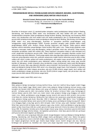 Khairatul, Ummah and Mucharommah, Sartika Ami and Ospa, Pea Yuanita Meishanti (2021) Pengembangan modul pembelajaran biologi berbasis Reading, Questioning, and Answering (RQA) materi virus kelas X. Jurnal Biologi dan Pembelajarannya (JBP), 8 (1): 4. pp. 19-25. ISSN 2406-8659