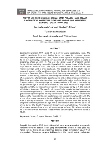 -, Aan Nurhasanah and -, Aryanti Wardiyah and -, Rilyani (2023) Faktor yang berhubungan dengan stres pada ibu hamil selama pandemi di Wilayah Kerja Puskesmas Bandar Jaya Kabupaten Lampung Tengah Tahun 2022. Manuju: Malahayati Nursing Journal, 5 (1): 3. pp. 23-36. ISSN 2655-2728