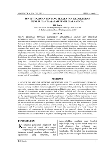 SUATU TINJAUAN TENTANG PERALATAN KEDOKTERAN NUKLIR DAN MASALAH PEMELIHARAANNYA. Peralatan Kedokteran Nuklir (PKN) tergolong rumit serta memerlukan perhatian untuk mempertahankan agar tetap berada dalam kondisi operasional yang baik, dan terdapat berbagai kendala dalam melaksanakan perawatannya terutama di negara sedang berkembang. Beberapa kendala yang terdeteksi adalah akibat gangguan kondisi lingkungan, tidak adanya dukungan engineer dari pabrik alat, tidak memadai staf lokal terlatih, kesulitan mendapatkan spareparts, komplikasi administratif, masalah dana, dsb-nya. Dalam makalah ini dikemukakan dan dibahas secara ringkas faktor tersebut berdasarkan pengalaman melaksanakan perawatan peralatan kedokteran nuklir di berbagai rumahsakit, selanjutnya dikemukakan catatan perawatan peralatan Gamma Camera dan kondisi saat ini sebagai ilustrasi. Juga dikemukakan upaya yang harus dilakukan dalam suatu sistem perawatan komprehensif terutama untuk peralatan kedokteran nuklir yang masih operasional dan atau yang baru. Dikemukakan pula organisasi dan manajemen sistem perawatan maju yang meliputi komponen : 1) kesehatan laboratorium, 2) pemeliharaan preventif dan 3) pemeliharaan korektif untuk dapat diadopsi. Berdasarkan review pada pengalaman negara-negara sedang berkembang, mengembangkan kemampuan sendiri dalam melaksanakan perawatan alat adalah sangat penting, karena dengan menggunakan sistem kontrak akan sangat mahal dan selalu tergantung pihak lain. Utuk meningkatkan keandalan dan memperbaiki kualitas PKN perlu dilakukan program kendali kualitas secara rutin di rumahsakit.