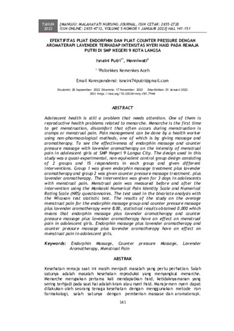 Isnaini Putri and Henniwati (2023) Efektifitas pijat endorfhin dan pijat counter pressure dengan aromaterapi lavender terhadap intensitas nyeri haid pada remaja putri di SMP Negeri 9 Kota Langsa. MANUJU: Malahayati Nursing Journal, 5 (1): 12. pp. 141-151. ISSN 2655-2728