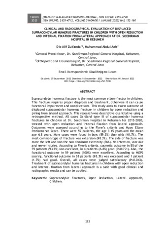 Dio Alif Zulfanda and Muhammad Abdul Azis (2023) Clinical and radiographical evaluation of displaced supracondylar humerus fractures in children with open reduction and internal fixation from lateral approach at Dr. Soedirman Hospital In Kebumen. MANUJU: Malahayati Nursing Journal, 5 (1): 13. pp. 152-160. ISSN 2655-2728