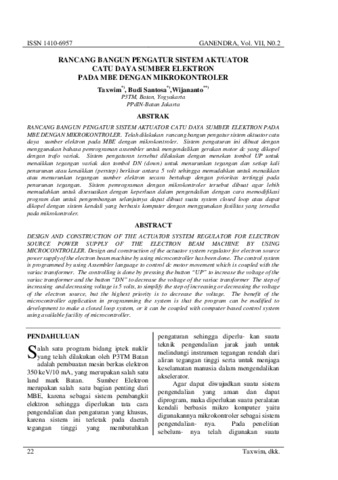 RANCANG BANGUN PENGATUR SISTEM AKTUATOR CATU DAYA SUMBER ELEKTRON PADA MBE DENGAN MIKROKONTROLER. Telah dilakukan rancang bangun pengatur sistem aktuator catu daya sumber elektron pada MBE dengan mikrokontroler. Sistem pengaturan ini dibuat dengan menggunakan bahasa pemrograman assembler untuk mengendalikan gerakan motor dc yang dikopel dengan trafo variak. Sistem pengaturan tersebut dilakukan dengan menekan tombol UP untuk menaikkan tegangan variak dan tombol DN (down) untuk menurunkan tegangan dan setiap kali penurunan atau kenaikkan (perstep) berkisar antara 5 volt sehingga memudahkan untuk menaikkan atau menurunkan tegangan sumber elektron secara bertahap dengan prioritas tertinggi pada penurunan tegangan. Sistem pemrograman dengan mikrokontroler tersebut dibuat agar lebih memudahkan untuk disesuaikan dengan keperluan dalam pengendalian dengan cara memodifikasi program dan untuk pengembangan selanjutnya dapat dibuat suatu system closed loop atau dapat dikopel dengan sistem kendali yang berbasis komputer dengan menggunakan fasilitas yang tersedia pada mikrokontroler.