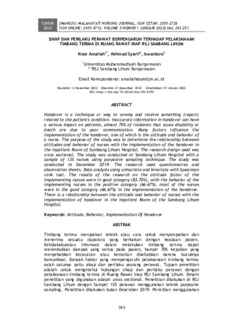 Noor Amaliah and Akhmad Syarif and Iswantoro (2023) Sikap dan perilaku perawat berpengaruh terhadap pelaksanaan timbang terima di Ruang Rawat Inap RSJ Sambang Lihum. Manuju: Malahayati Nursing Journal, 5 (1): 21. pp. 243-251. ISSN 2655-2728