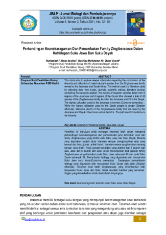 Nurhazizah, Nurhazizah and Rona, Sabrina and Wachida, Maftuhatun N. and Diana, Vivanti (2021) Perbandingan keanekaragaman dan pemanfaatan family Zingiberaceae dalam kehidupan suku Jawa dan suku Dayak. Jurnal Biologi dan Pembelajarannya (JBP), 8 (2): 4. pp. 72-83. ISSN 2406-8659