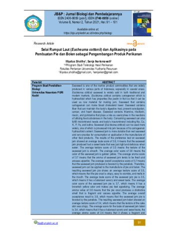 Illiyatus, Sholiha and Senja, Ikerismawati (2021) Selai rumput laut (Eucheuma cottonii) dan aplikasinya pada pembuatan pie dan bolen sebagai pengembangan produk perikanan. Jurnal Biologi dan Pembelajarannya (JBP), 8 (2): 6. pp. 91-101. ISSN 2406-8659