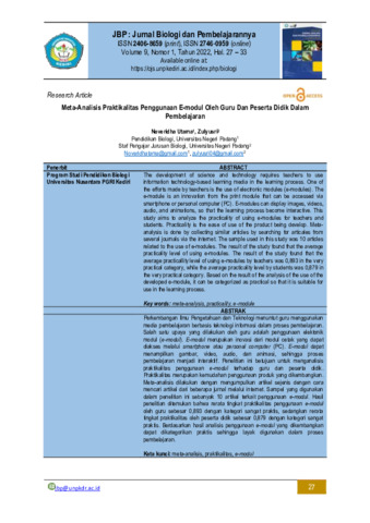 Noveridha, Utama and Zulyusri, Zulyusri (2022) Meta-analisis praktikalitas penggunaan e-modul oleh guru dan peserta didik dalam pembelajaran. Jurnal Biologi dan Pembelajarannya (JBP), 9 (1): 3. pp. 27-33. ISSN 2406-8659