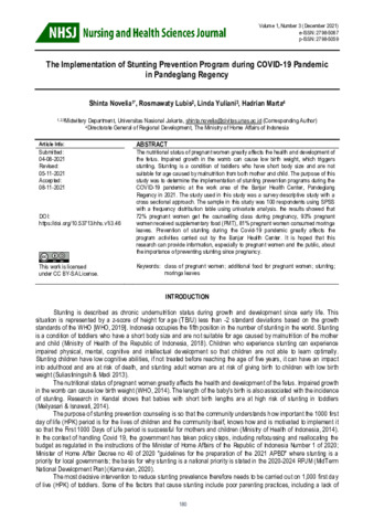 Shinta, Novelia and Rosmawaty, Lubis and Linda, Yuliani and Hadrian, Marta (2021) The Implementation of Stunting Prevention Program during COVID-19 Pandemic in Pandeglang Regency. Nursing and Health Sciences Journal, 1 (3): 1. pp. 180-183. ISSN 2798-5059
