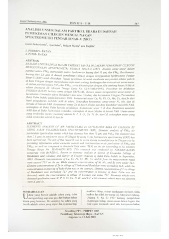 Analisis unsur-unsur dalam partikel udara PM10 (particulate matter berdiameter kurang dari 10 pm) dan PM2,5 (berdiameter kurang dari 2,5 µm) di daerah pemukiman Cilegon dengan menggunakan Spektrometri Pendar Sinar-X (XRF) telah dilakukan. Tujuan penelitian ini untuk membantu masyarakat sekitar pabrik di kota Cilegon dengan menyediakan informasi tentang kandungan dan konsentrasi unsur-unsur di dalam partikel udara PM10 dan PM2,5, serta dibandingkan dengan nilai ambang batas (NAB) di udara (menurut SE Menteri Tenaga Kerja No. SE-01/MEN/1997). Penelitian ini dilakukan P3KRBIN-BATAN bekerja sama dengan BAPEDAL, Banten dalam menganalisis unsur-unsur di kecamatan Ciwandan (desa Randakari dan desa Cilodan) dan kecamatan Cilegon (Perumahan Bukit Palm Indah) pada September 2003. Konsentrasi unsur Cu, Fe, Pb, Cr, Mn, Co, dan Sr dari hasil pengukuran melebihi NAB di udara. Sedangkan konsentrasi unsur-unsur Ni, Mo, dan Bi berada di bawah NAB. Konsentrasi unsur Zn di desa Cilodan dan desa Randakari melebihi NAB, sedangkan di Bukit Palm berlaku sebaliknya. Konsentrasi unsur V di desa Randakari melebihi NAB dan di Bukit Palm tidak terdeteksi, sedangkan di desa Cilodan di bawah NAB. Unsur-unsur yang terdeteksi secara kualitatif adalah Si, P. S. Cl. Ca, Ti, Br, dan Cd, sedangkan unsur yang tidak terdeteksi adalah K dan As.