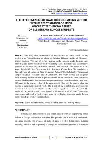 Kartika, Yuni Purwanti and Lisa, Virdinarti Putra (2022) The effectiveness of game based learning method with perfect number media on creative thinking ability of elementary school students. Jurnal Pendidikan Dasar Nusantara, 8 (1): 4. pp. 38-45. ISSN 2460-6324