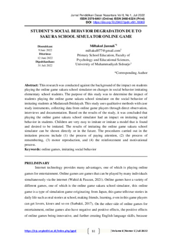 Miftakul, Jannah (2022) Student's social behavior degradation due to Sakura School simulator online game. Jurnal Pendidikan Dasar Nusantara, 8 (1): 8. pp. 81-89. ISSN 2460-6324