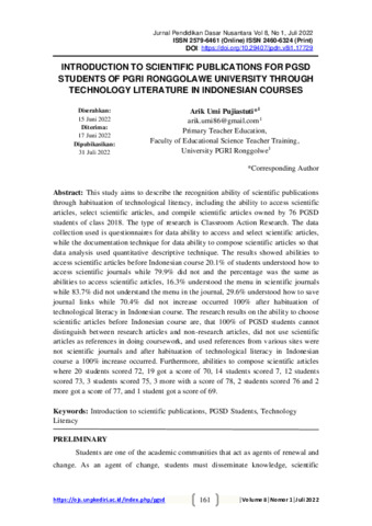 Arik, Umi Pujiastuti (2022) Introduction to scientific publications for PGSD students of PGRI Ronggolawe University through technology literature in Indonesian courses. Jurnal Pendidikan Dasar Nusantara, 8 (1): 15. pp. 161-173. ISSN 2460-6324