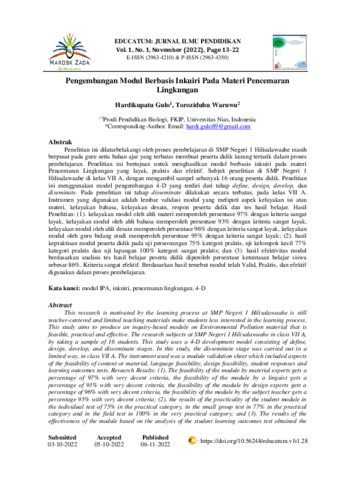 Hardikupatu Gulo and Toroziduhu Waruwu (2022) Pengembangan modul berbasis inkuiri pada materi pencemaran lingkungan. Educatum: Jurnal Ilmu Pendidikan, 1 (1): 2. pp. 13-22. ISSN 2963-4350