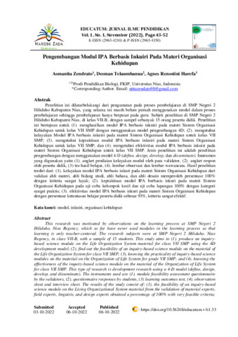 Asmanita Zendrato and Desman Telaumbanua and Agnes Renostini Harefa (2022) Pengembangan modul IPA berbasis inkuiri pada materi organisasi kehidupan. Educatum: Jurnal Ilmu Pendidikan, 1 (1): 5. pp. 43-52. ISSN 2963-4350