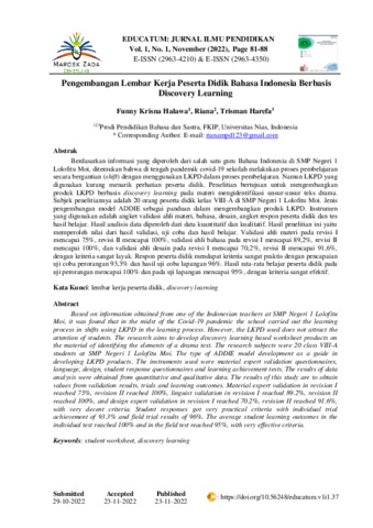 Funny Krisna Halawa and Riana and Trisman Harefa (2022) Pengembangan lembar kerja peserta didik bahasa indonesia berbasis discovery learning. Educatum: Jurnal Ilmu Pendidikan, 1 (1): 10. pp. 81-88. ISSN 2963-4350