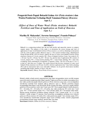 Marlita, H. Makaruku and Saverus, Samangun and Fransin, Polnaya (2022) Pengaruh dosis pupuk bokashi gulma air (Pistia stratiotes) dan waktu pemberian terhadap hasil tanaman pakcoy (Brassica rapa L.). Jurnal Pertanian Kepulauan, 6 (1): 1. pp. 1-8. ISSN 1412-5005