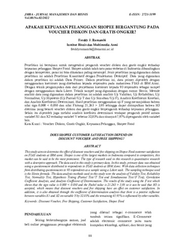 Freddy, J. Rumambi (2022) Apakah kepuasan pelanggan Shopee bergantung pada voucher diskon dan gratis ongkir? JMBA - Jurnal Manajemen dan Bisnis Asmi, 8 (2). pp. 88-100. ISSN 2721-5199