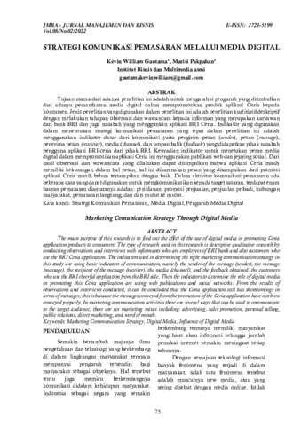 Kevin, William Gautama and Marisi, Pakpahan (2022) Strategi komunikasi pemasaran melalui media digital. JMBA - Jurnal Manajemen dan Bisnis Asmi, 8 (2). pp. 75-81. ISSN 2721-5199