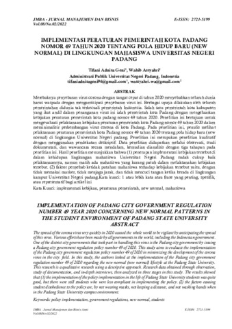 Tifani, Adnisa Geni and Wahib, Assyahri (2022) Implementasi Peraturan Pemerintah Kota Padang Nomor 49 Tahun 2020 tentang pola hidup baru (new normal) di lingkungan mahasiswa Universitas Negeri Padang. JMBA - Jurnal Manajemen dan Bisnis Asmi, 8 (2). pp. 43-51. ISSN 2721-5199
