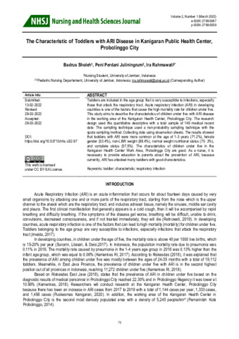 Badrus, Sholeh and Peni Perdani, Juliningrum and Ira, Rahmawati (2022) The characteristic of toddlers with ARI disease in Kanigaran Public Health Center, Probolinggo City. Nursing and Health Sciences Journal, 2 (1): 14. pp. 79-86. ISSN 2798-5059