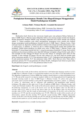 Arisman, Hulu and Trisman, Harefa and Arozatulo, Bawamenewi (2022) Peningkatan kemampuan menulis teks biografi dengan menggunakan model pembelajaran scientific. Educatum: Jurnal Ilmu Pendidikan, 1 (1): 12. pp. 96-101. ISSN 2963-4350