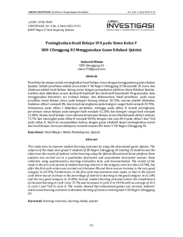 Mimin, Sudarsih (2023) Peningkatkan hasil belajar IPA pada siswa kelas V SDN Cilenggang 03 menggunakan game edukasi Quizizz. Jurnal Investigasi : Penelitian dan Pengembangan Pendidikan, 4 (1): 2. pp. 9-15. ISSN 2720-9334