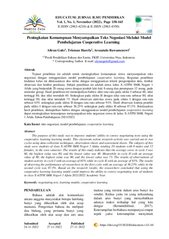 Aliran, Gulo and Trisman, Harefa and Arozatulo, Bawamenewi (2022) Peningkatan kemampuan menyampaikan teks negosiasi melalui model pembelajaran cooperative learning. Educatum: Jurnal Ilmu Pendidikan, 1 (1): 19. pp. 158-165. ISSN 2963-4350