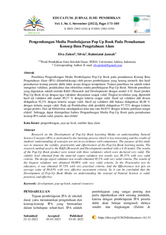 Elva, Zuleni and Silvia, Silvia and Rahmiatul, Jannah (2022) Pengembangan media pembelajaran pop up book pada pemahaman konsep Ilmu Pengetahuan Alam. Educatum: Jurnal Ilmu Pendidikan, 1 (1): 21. pp. 173-180. ISSN 2963-4350