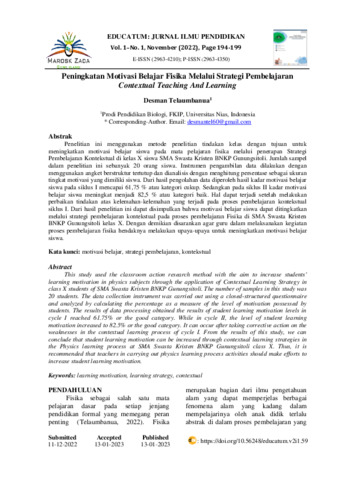 Desman, Telaumbanua (2022) Peningkatan motivasi belajar fisika melalui strategi pembelajaran contextual teaching and learning. Educatum: Jurnal Ilmu Pendidikan, 1 (1): 23. pp. 194-199. ISSN 2963-4350