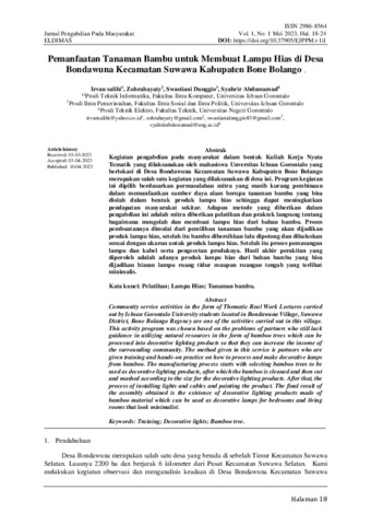 Irvan, Salihi and Zohrahayaty, Zohrahayaty and Swastiani, Dunggio and Syahrir, Abdussamad (2023) Pemanfaatan tanaman bambu untuk membuat lampu hias di Desa Bondawuna Kecamatan Suwawa Kabupaten Bone Bolango. Eldimas: Jurnal Pengabdian Pada Masyarakat, 1 (1): 3. pp. 18-24. ISSN 2987- 8564