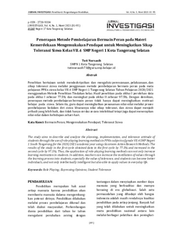 Tuti, Nursasih (2023) Penerapan metode pembelajaran bermain peran pada materi kemerdekaan mengemukakan pendapat untuk meningkatkan sikap toleransi siswa kelas vii.4 SMP Negeri 1 Kota Tangerang Selatan. Jurnal Investigasi : Penelitian dan Pengembangan Pendidikan, 4 (1): 9. pp. 81-95. ISSN 2720-9334
