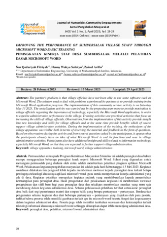 Nur, Qodariyah Fitriyah and Henny, Wahyu Sulistyo and Zainul, Arifin (2023) Peningkatan kinerja staf Desa Sumbersalak melalui pelatihan dasar Microsoft Word. JHCE: Jurnal Pengabdian Masyarakat, 1 (1): 4. pp. 19-24. ISSN 2988-4756