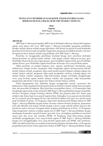 Supemi, Supemi (2023) Penguatan pendidikan karakter toleransi beragama berbasis budaya sekolah di SMP Negeri 1 Murung. Inspirator Guru, 5 (2): 8. pp. 69-76. ISSN 2654-2536
