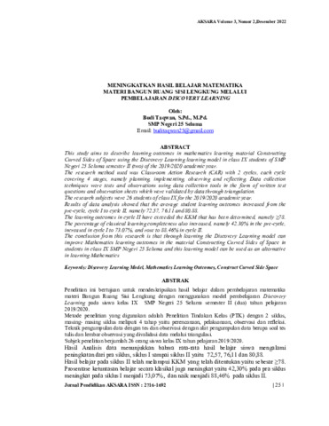 Budi, Taqwan (2022) Meningkatkan hasil belajar matematika materi bangun ruang sisi lengkung melalui pembelajaran discovery learning. Jurnal Pendidikan AKSARA, 3 (2): 4. pp. 25-34. ISSN 2716-1692