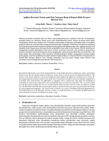 Arfan, Hadi and Masnur, Masnur and Syahirun, Alam and Muh, Zainal (2023) Aplikasi bercocok tanam pada pola tanaman buah di Rumah Bibit Parepare berbasis Web. KONTAK: Jurnal Komputer dan Teknik Informatika, 1 (1): 4. pp. 39-50. ISSN 2986-8343
